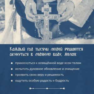 В ночь с 18 на 19 января совершается Великое водосвятие. На водоемах – реках, озерах или прудах – вырезают прорубь в форме креста или круга. Священники в праздничных одеждах проводят обряд, трижды погружая крест в ледяную воду.